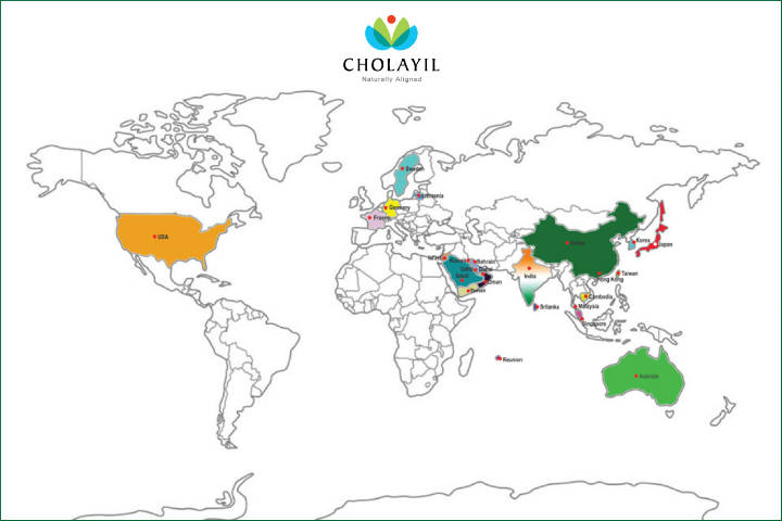 Spreading the reach of a business across the world is always a challenge. And, through constant association with enterprising people and organisations, we now boast of strong partners who have facilitated our business expansion to global markets. Cholayil’s overseas operations covers markets across Dubai, Saudi Arabia, Bahrain, Malaysia, China, Taiwan, France, Singapore, Lithuania, Oman, Kuwait, Germany, Cambodia, Qatar, South Korea, GUATEMALA, Sweden, Yemen, USA, HONGKONG, MAURITIUS, JAPAN, REUNION, Kenya, Tanzania, Uganda and the Americas.